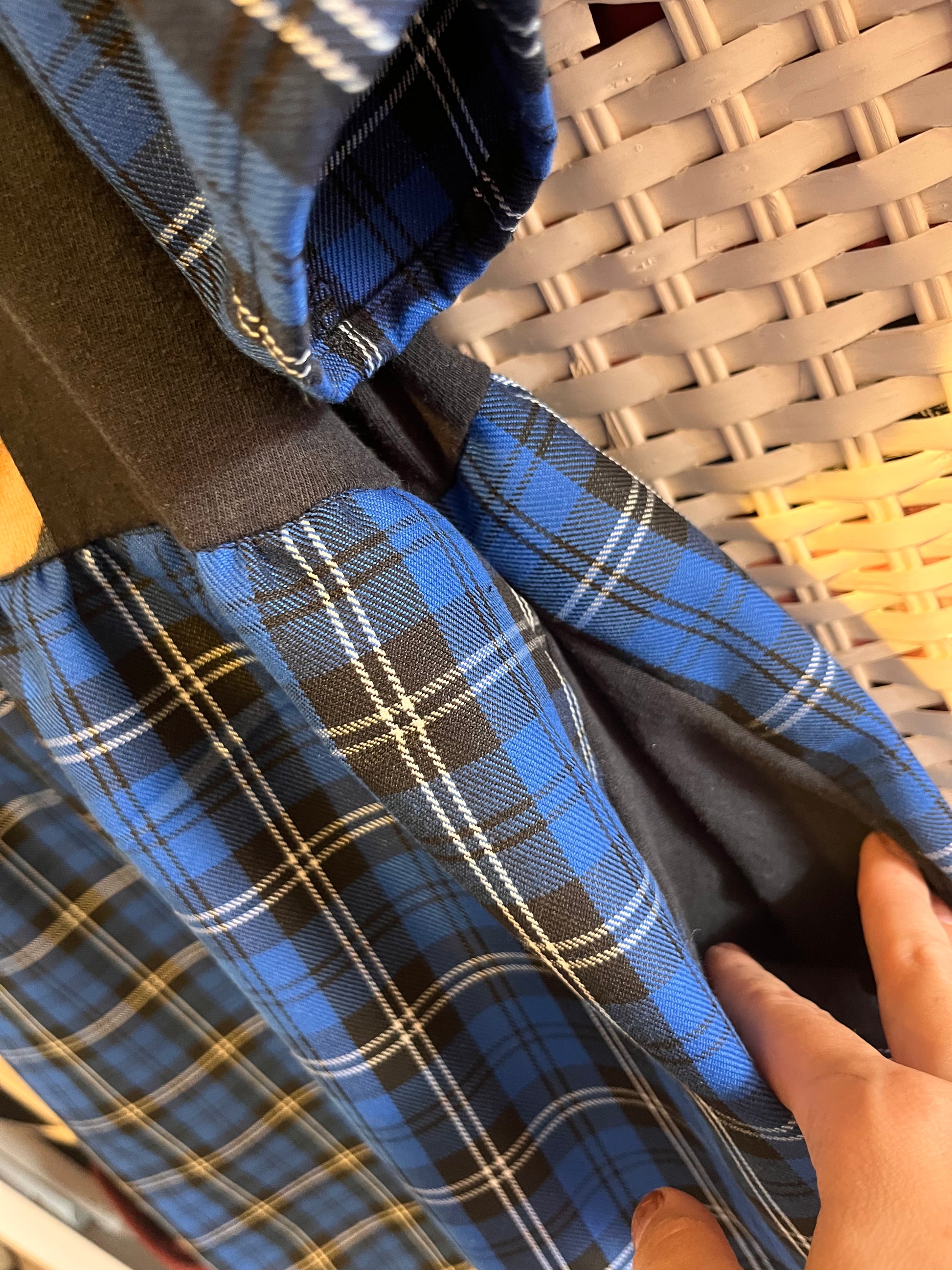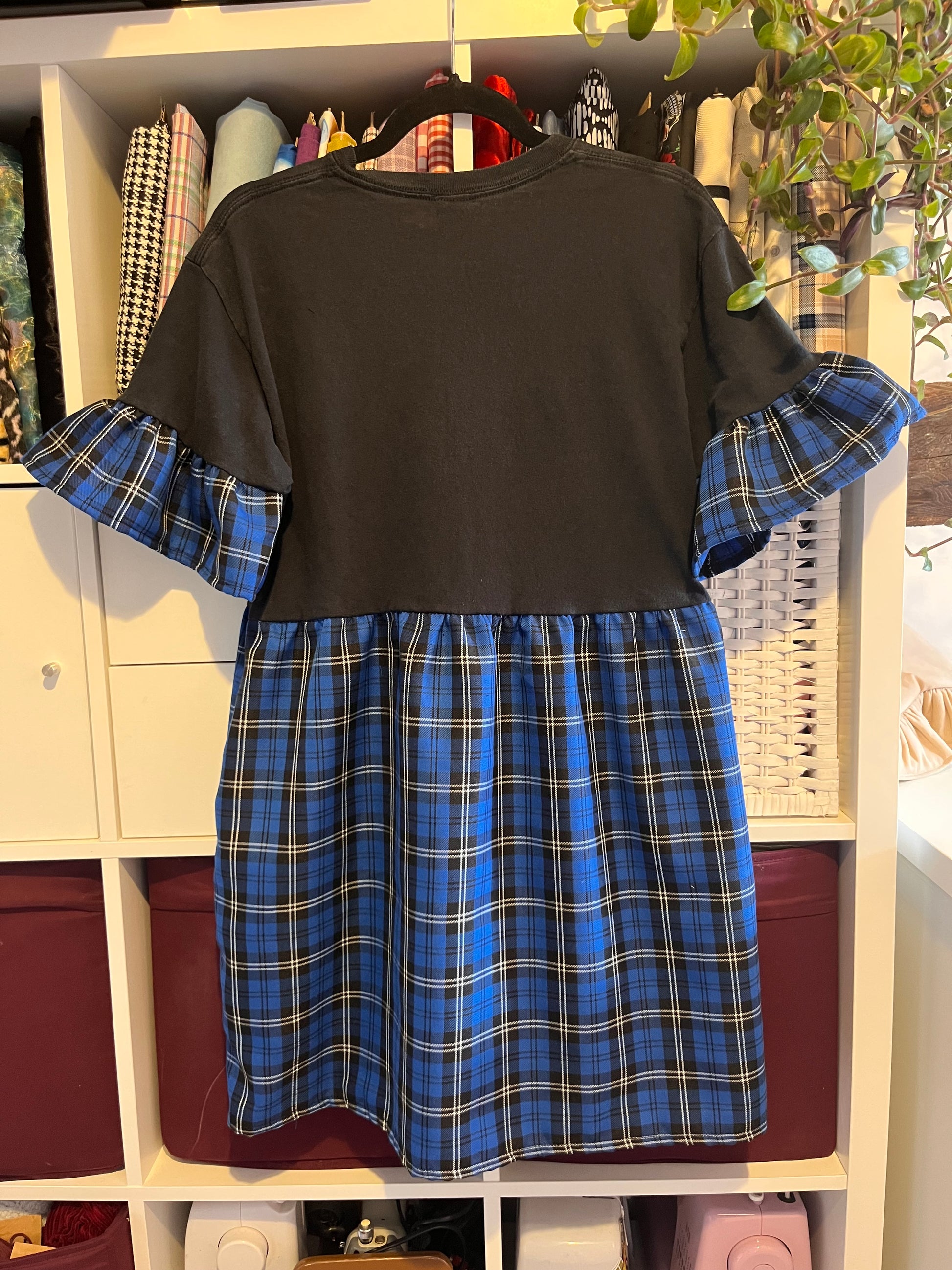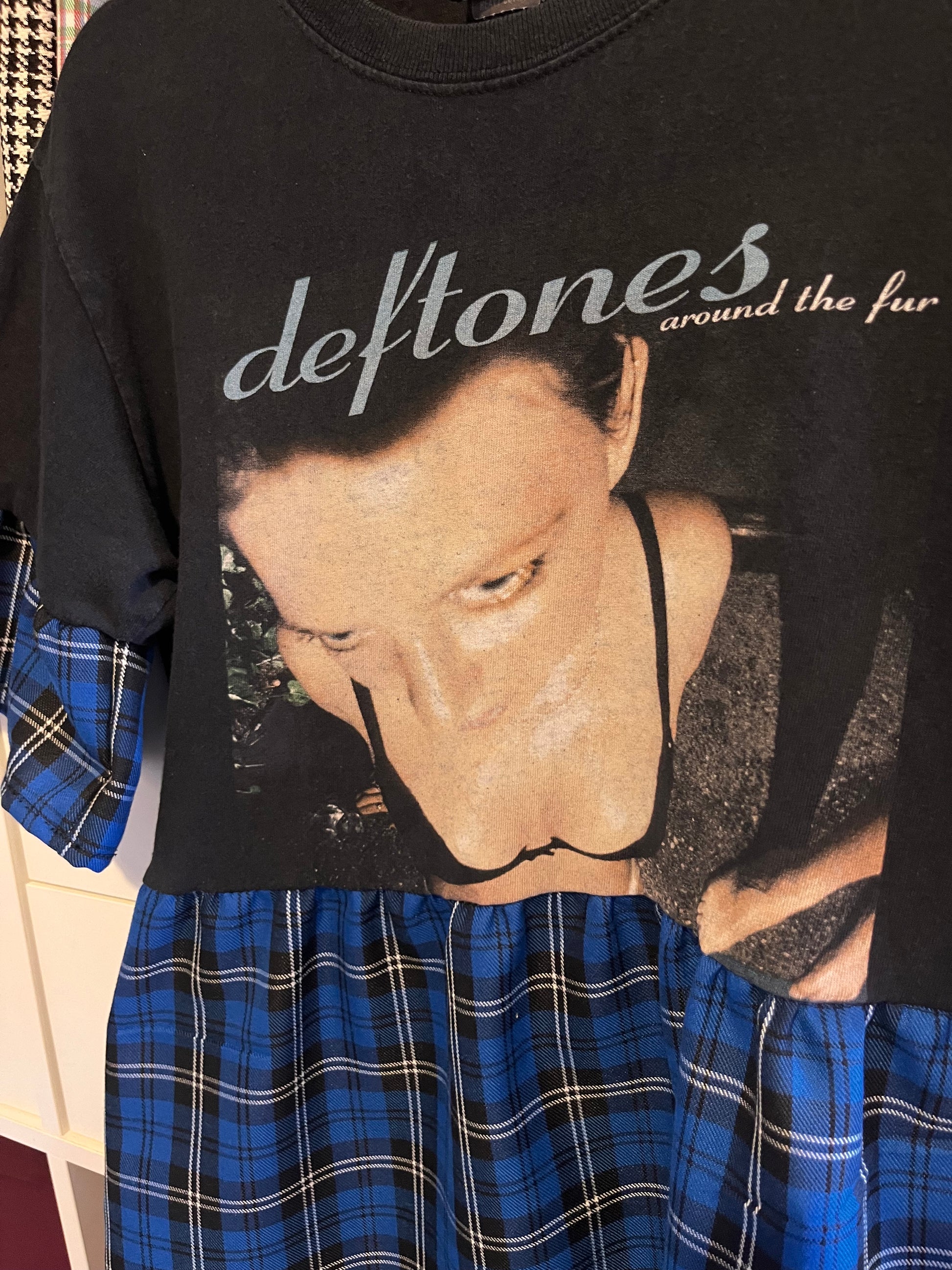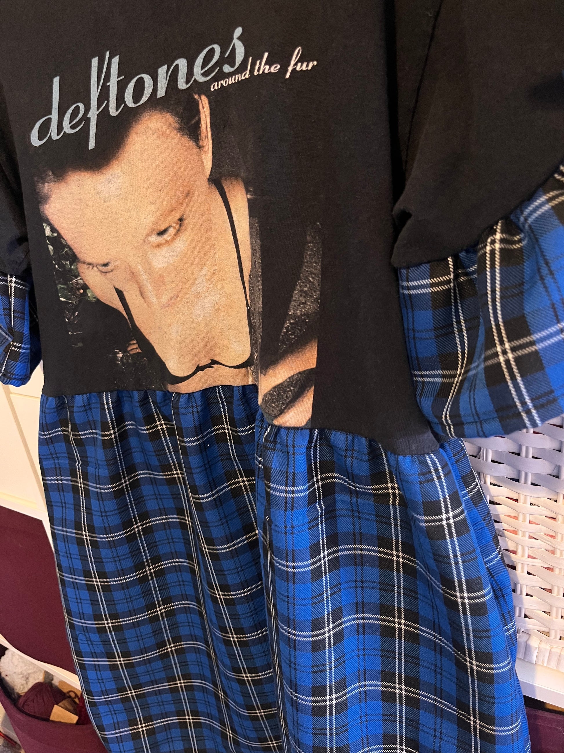 Heres the Deftones tee dress in the blue tartan fabric, with medium frills attached to the original sleeve.