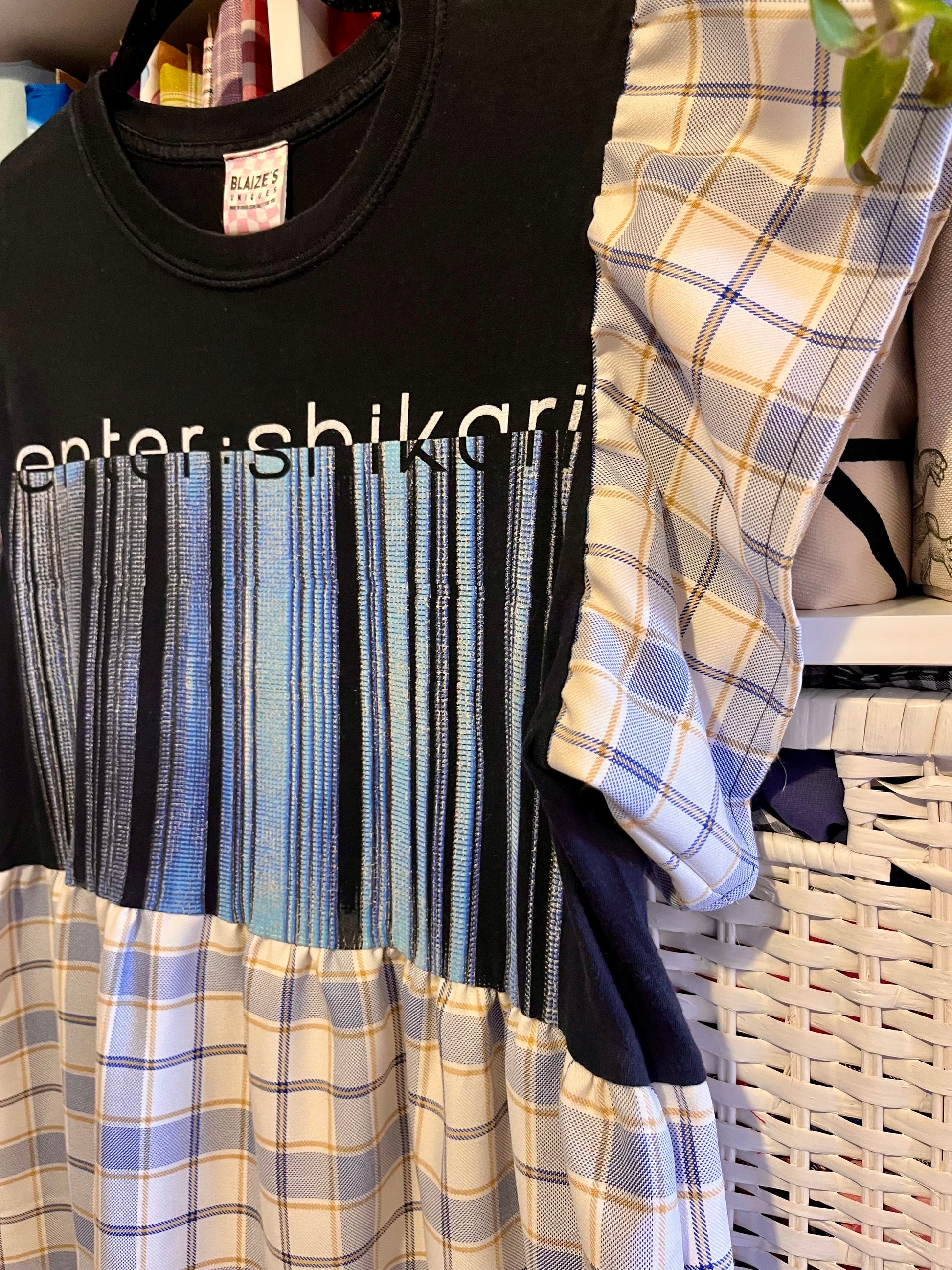 Heres the fun and super unique Enter Shikari tee dress in a one of blue tartan.