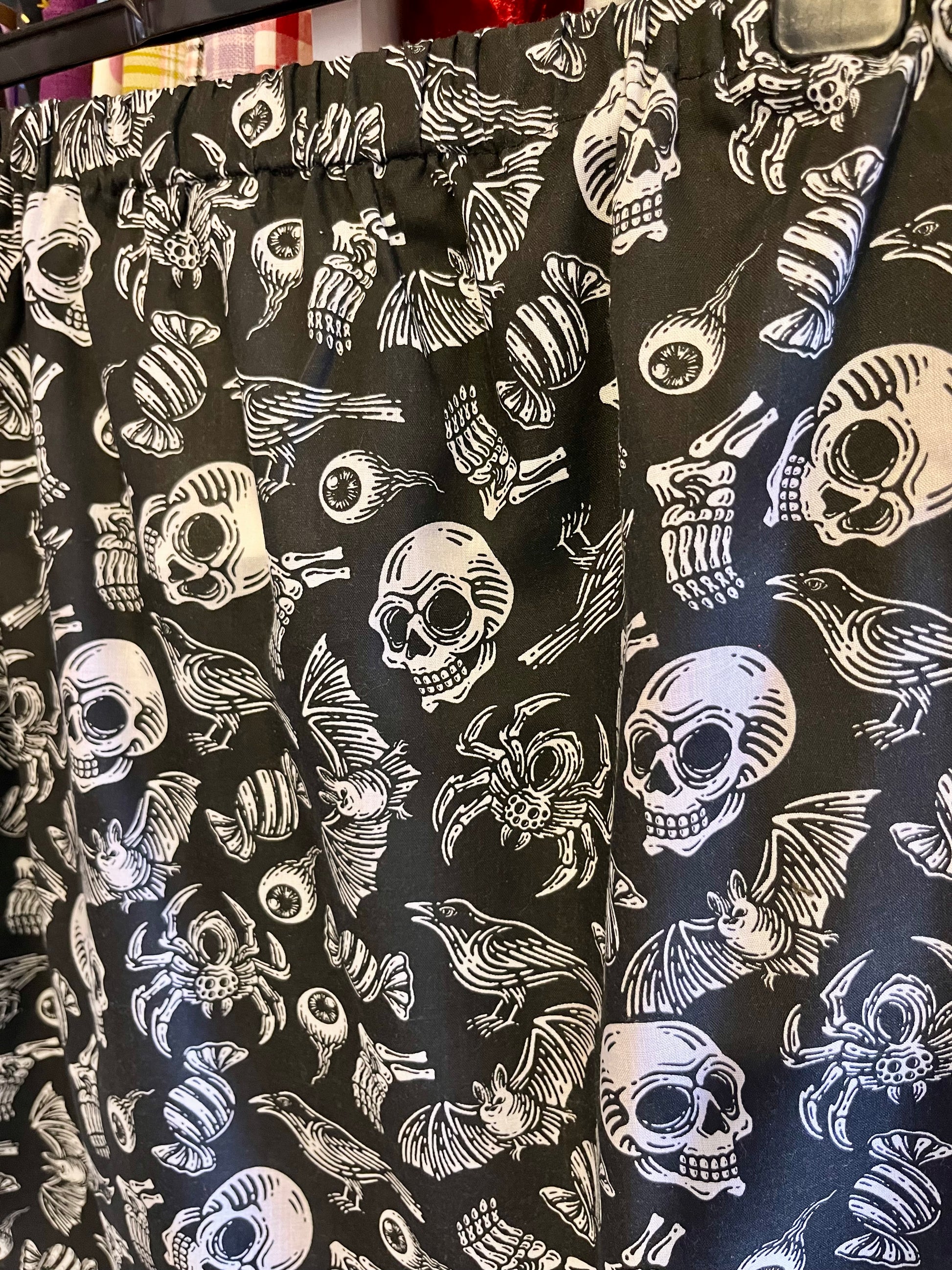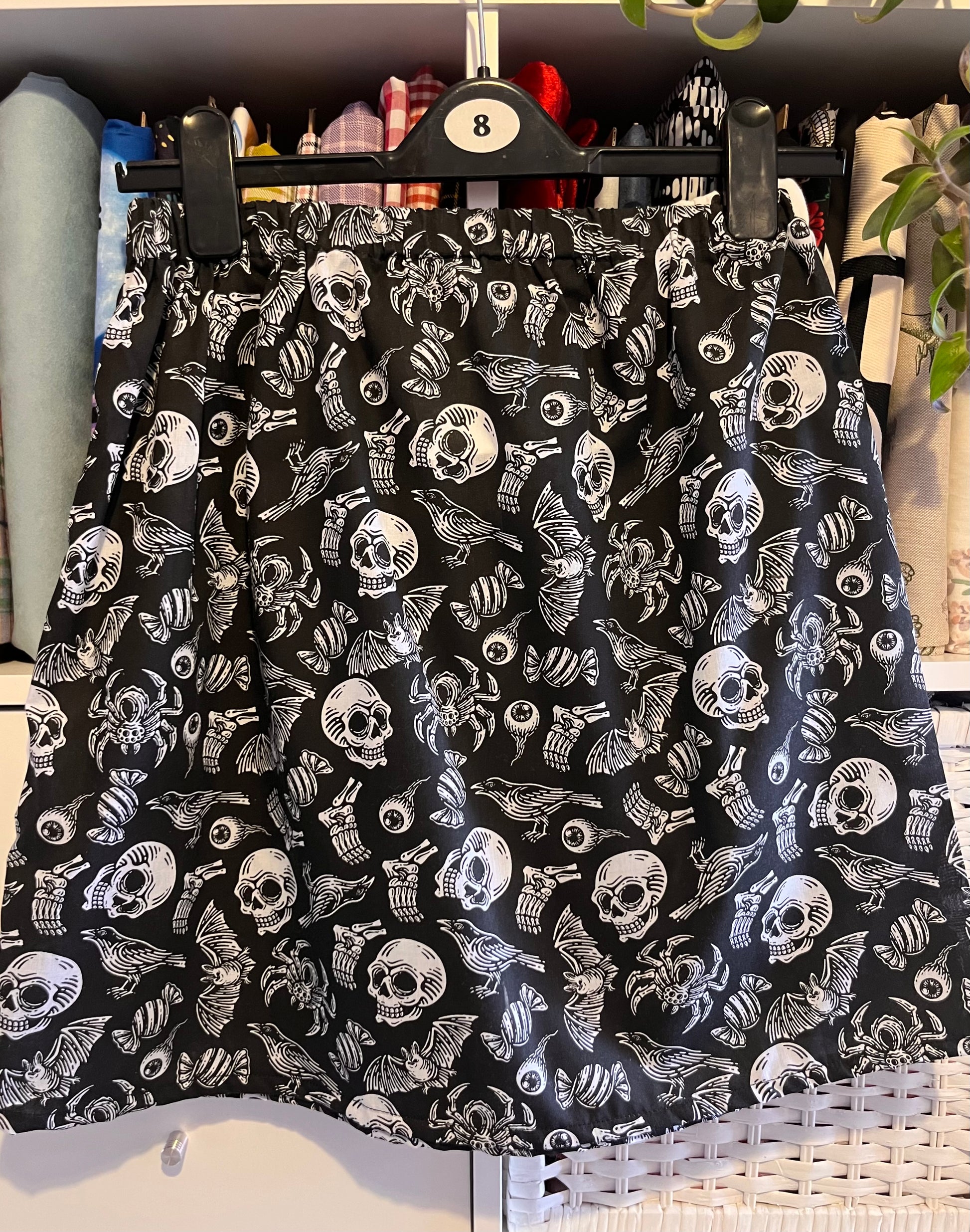 This is a ready to wear skirt. It’s made out of gorgeous Spooky Skull fabric.