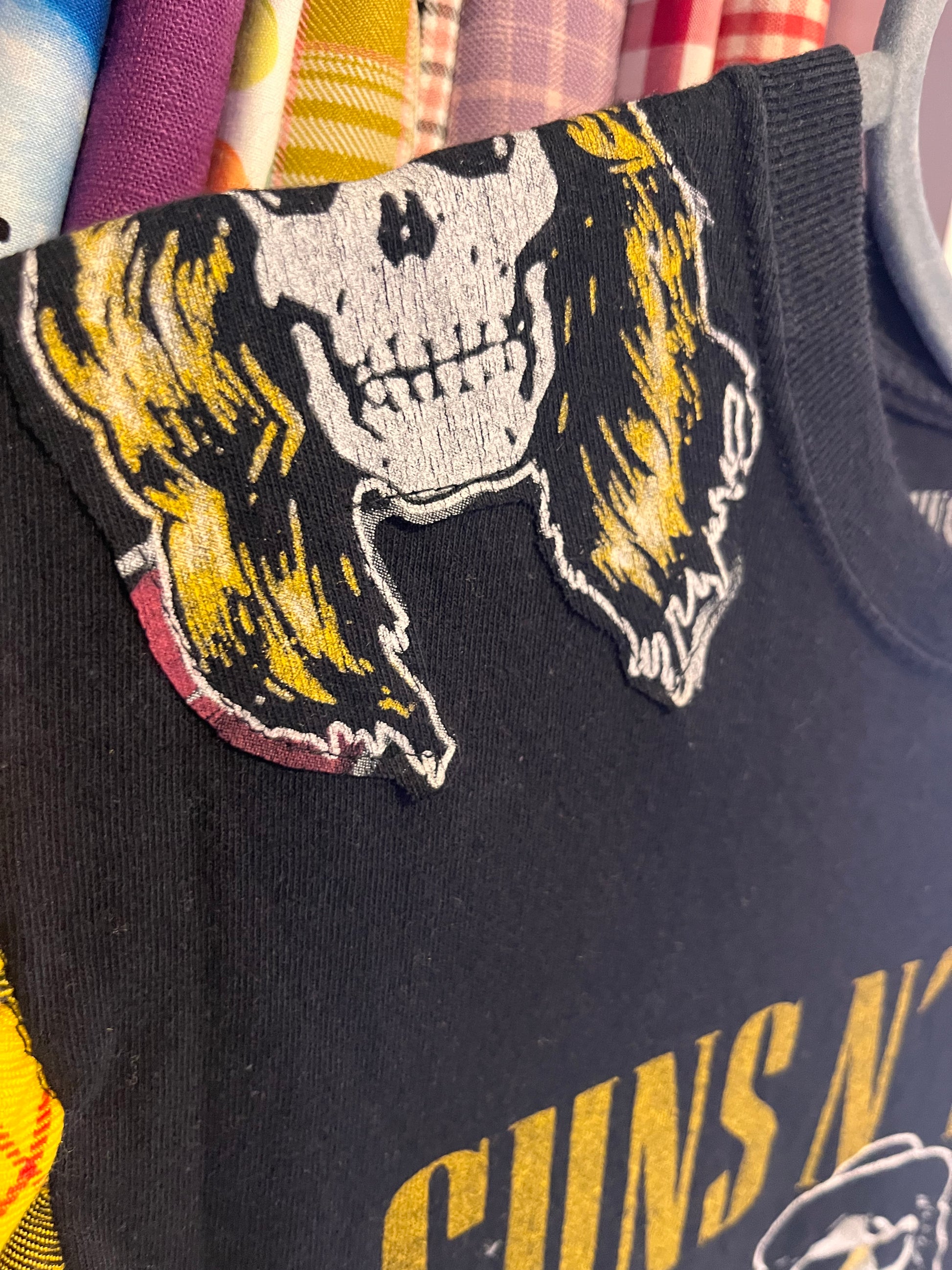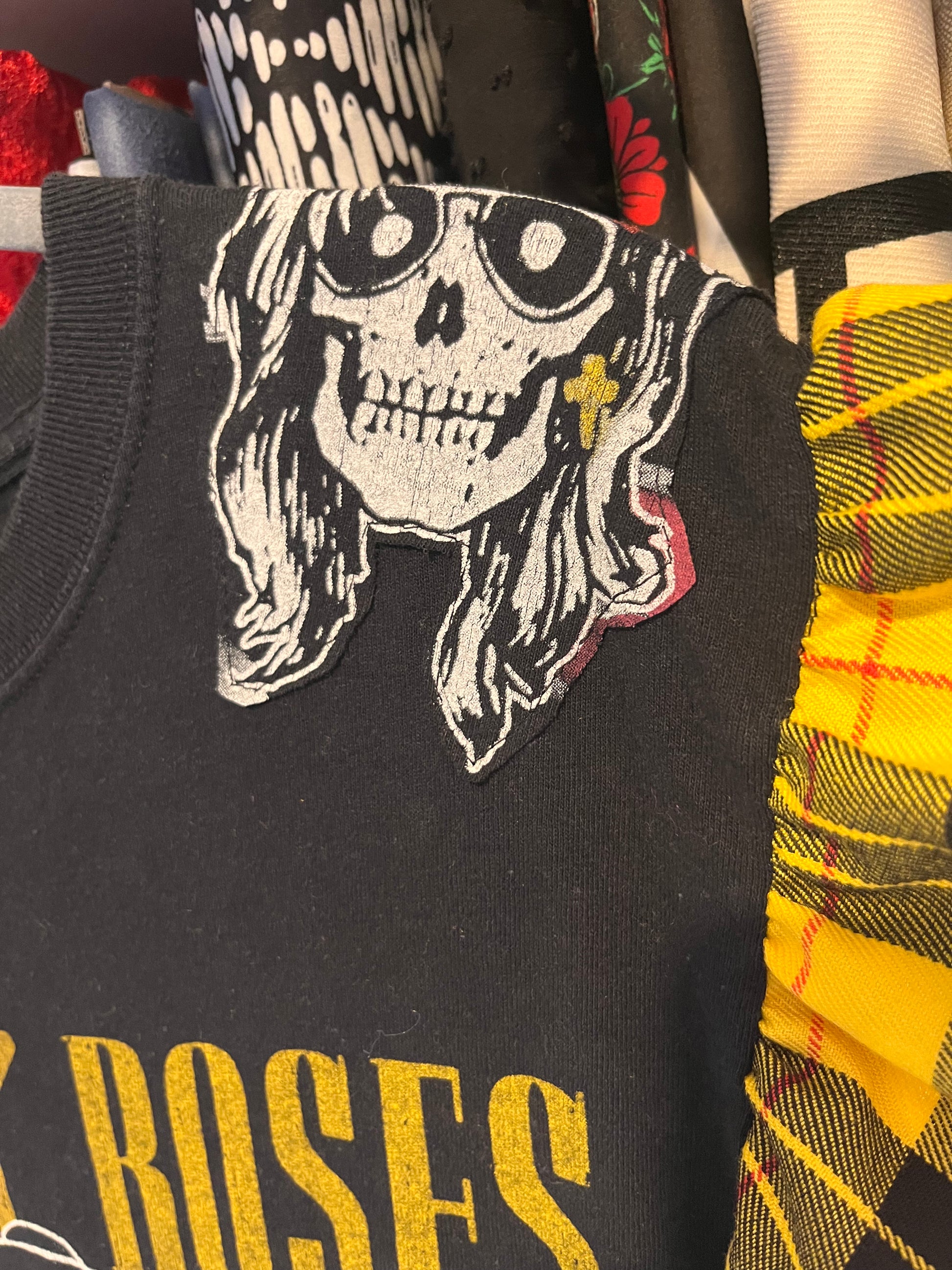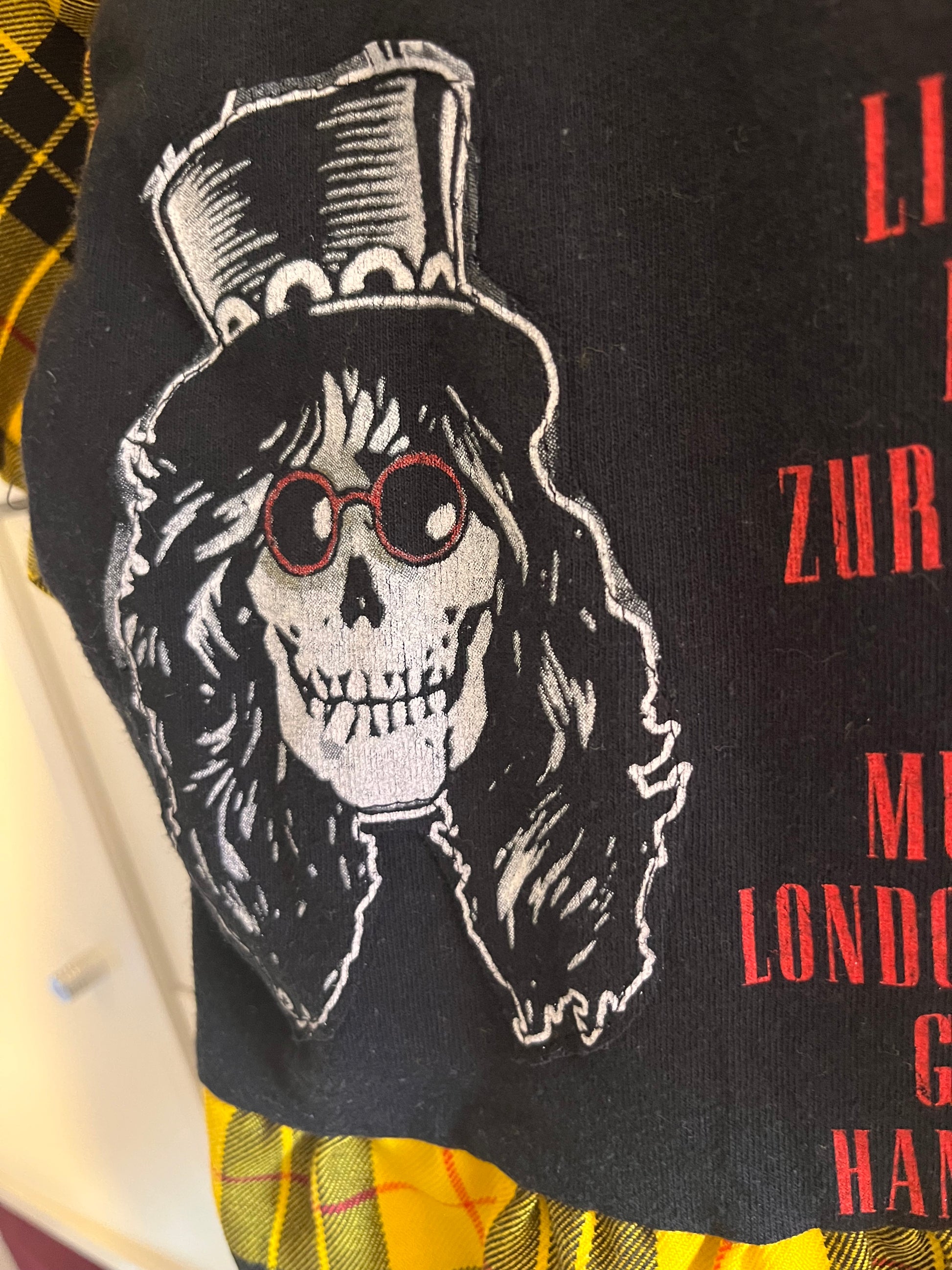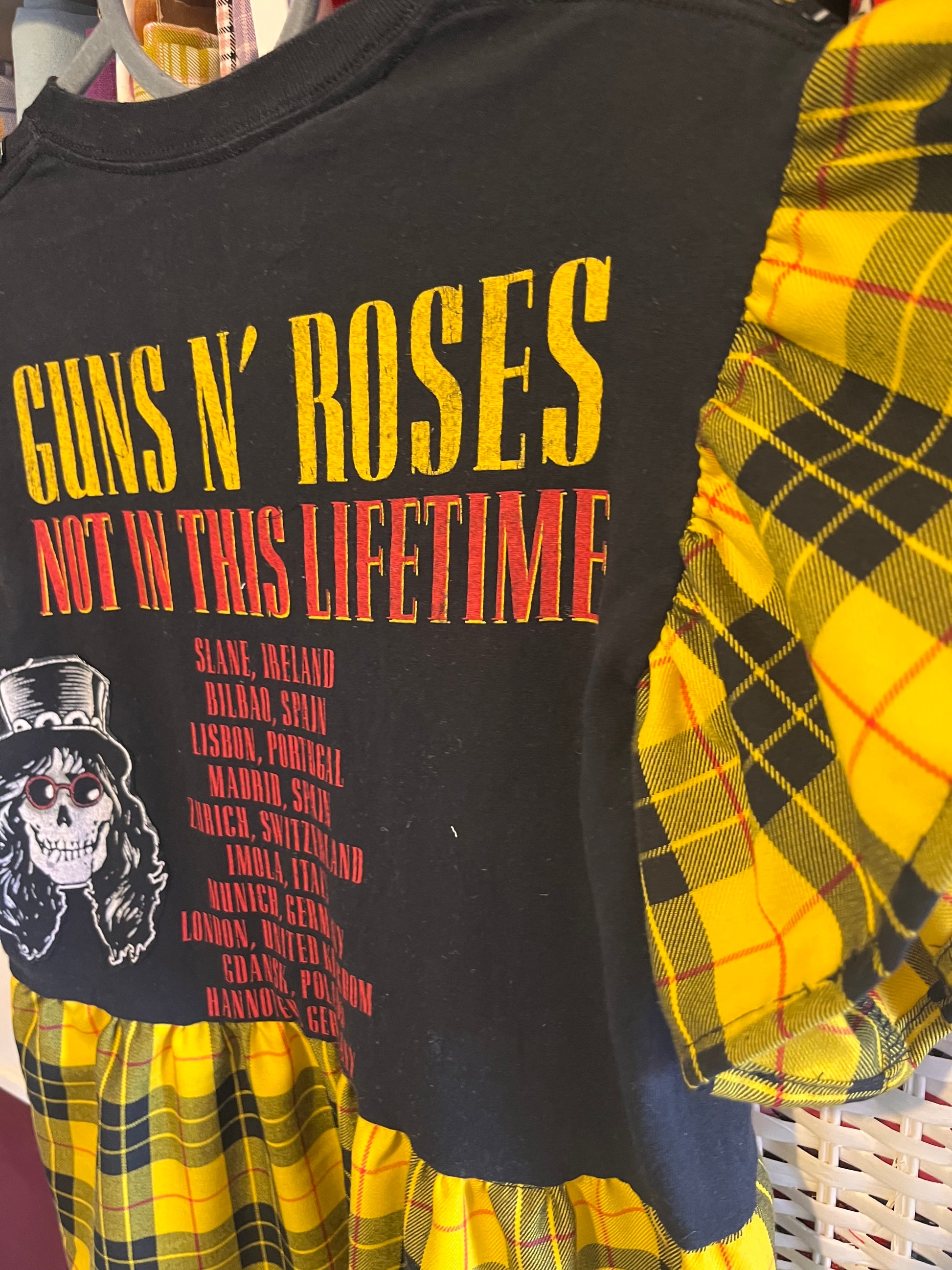 Heres the Guns and Roses tee dress in the yellow tartan fabric, with small frills added. I have utilised the rest of the tee by adding patches, making it super unique.