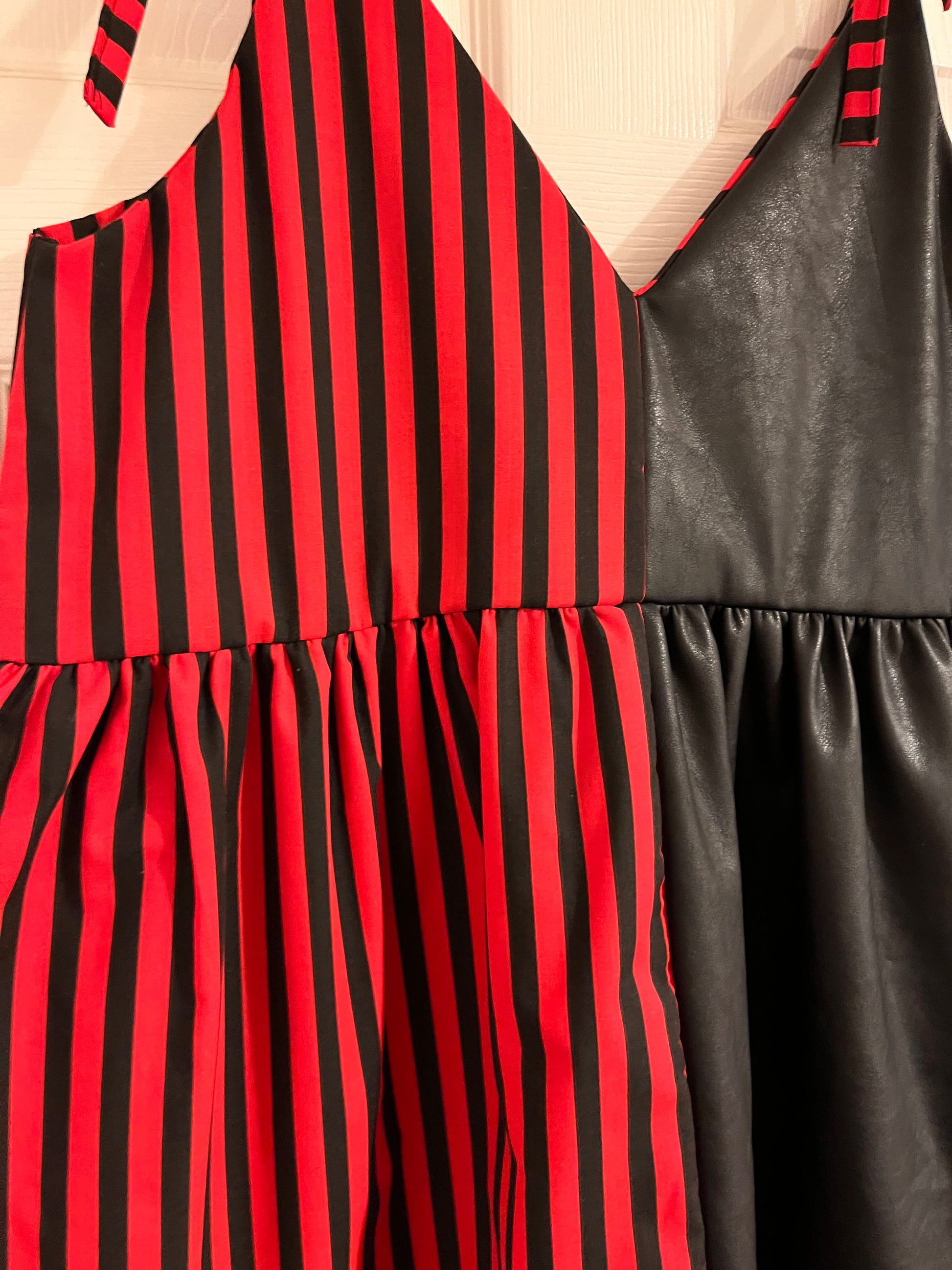 This is the gorgeous one of a kind mini split cami dress. Made up in the black leatherette and red and black cotton mix. With tie straps at the shoulders, so you can customise where the straps fall.