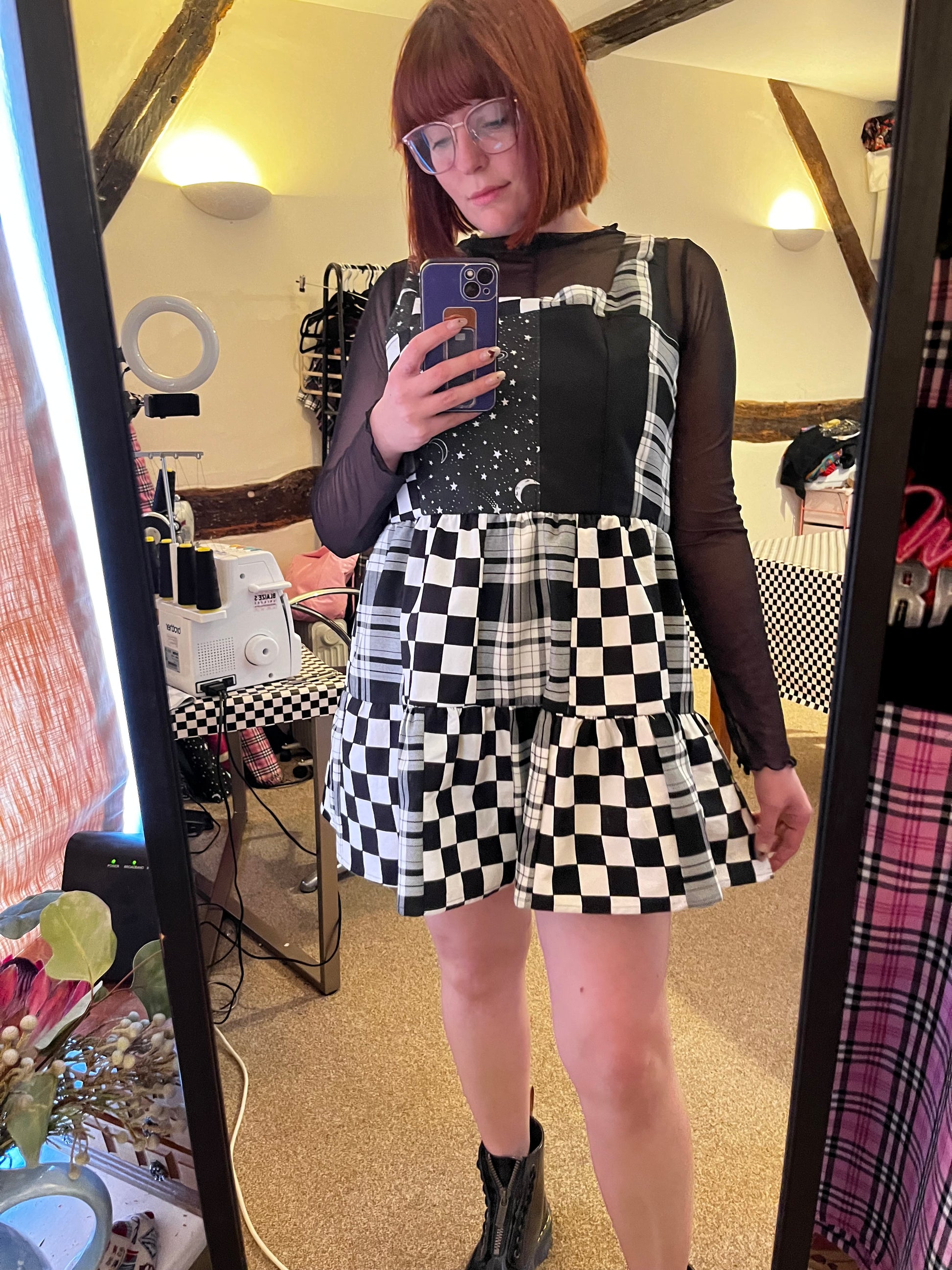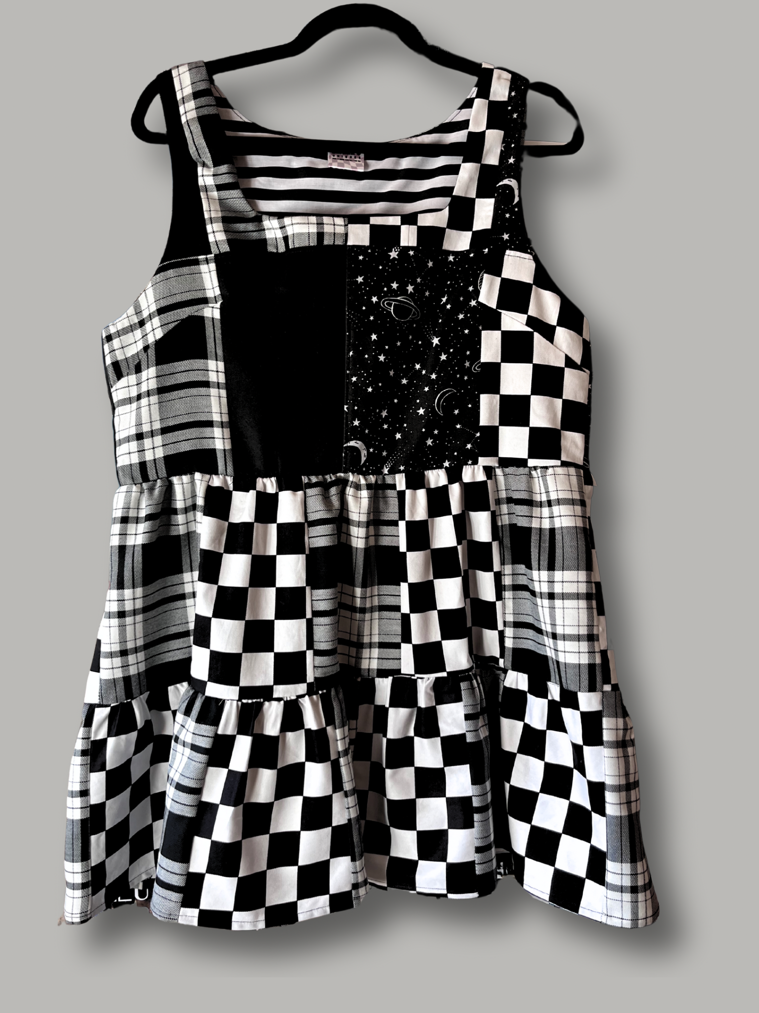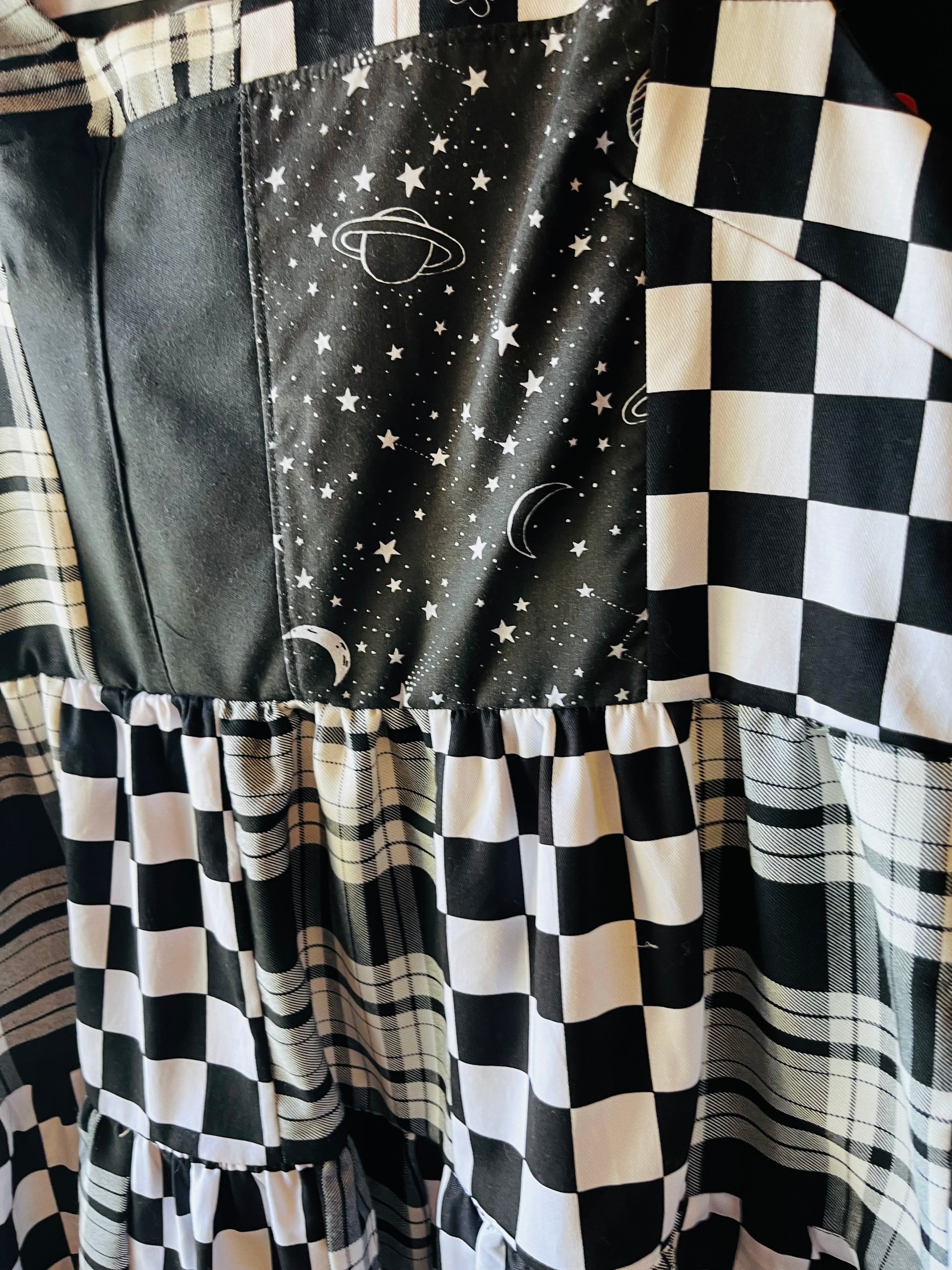 Heres the gorgeous scrap buster square drop neckline dress in a mixture of black and white fabrics with a black lining.