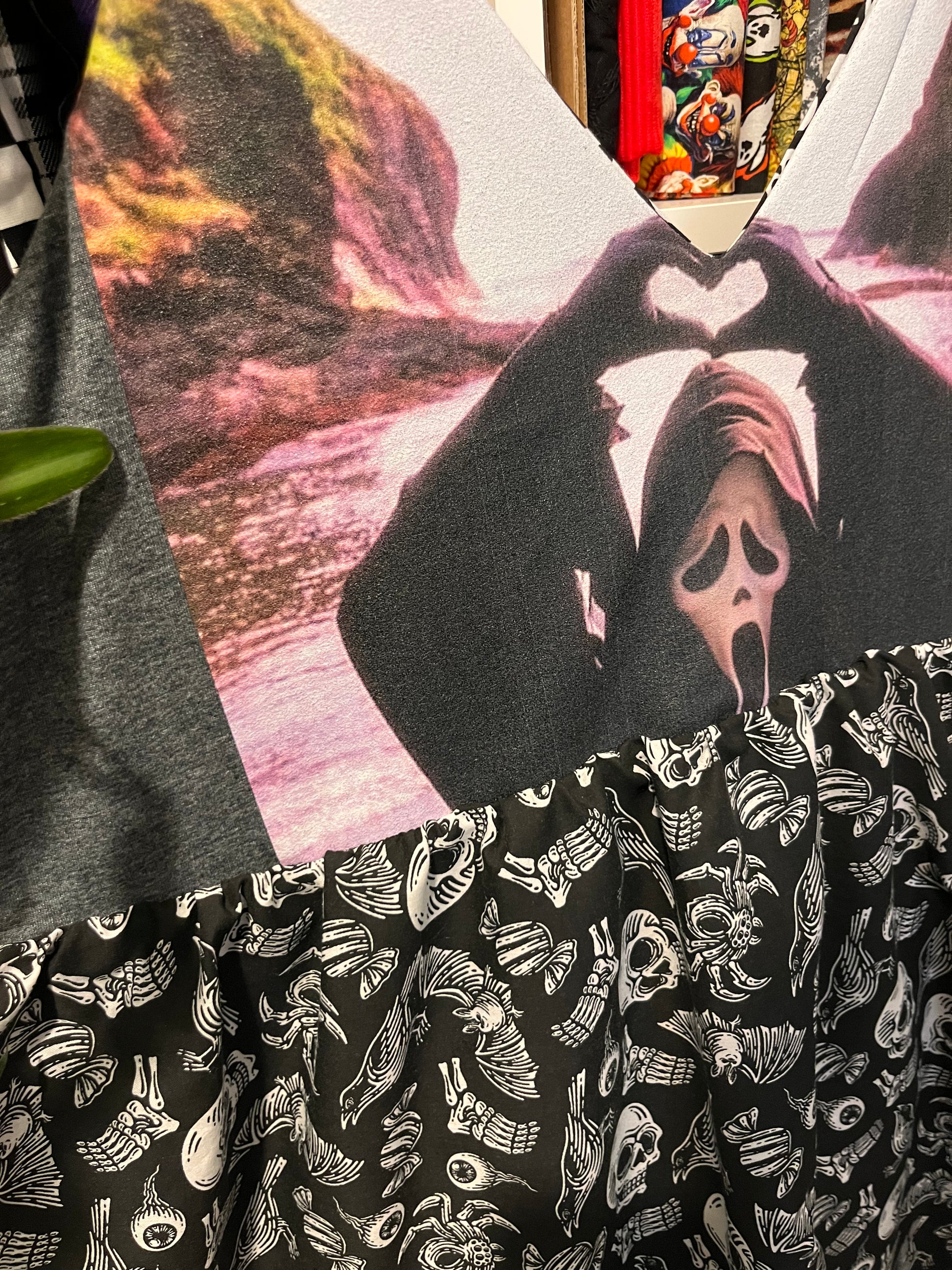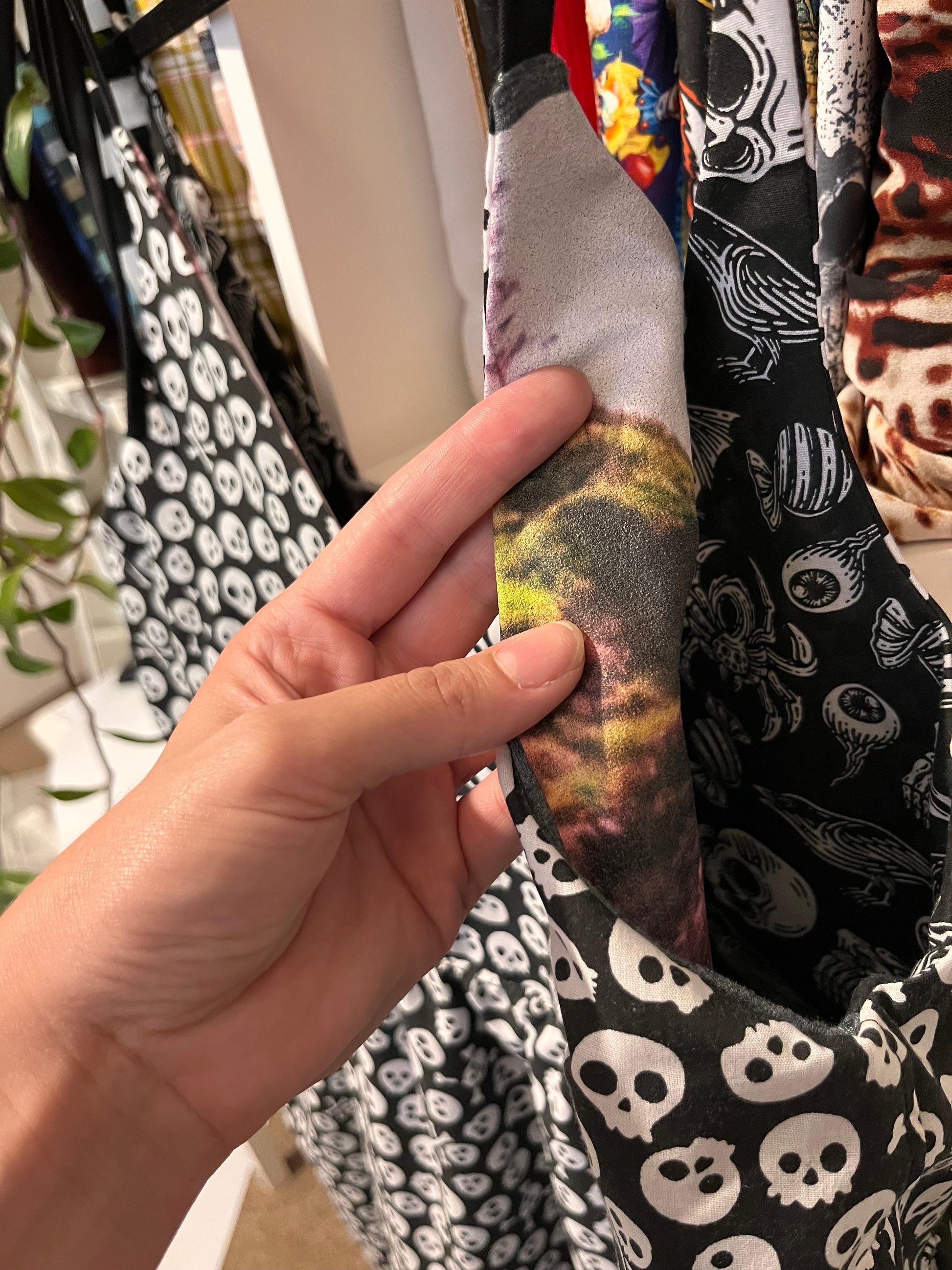Heres the first ever fully reversible cami dress, this really is 2 dresses in one, I hope you love it. One side is from a reworked tee with the spooky skull fabric, the other side is a cute skull print. This is perfect for Halloween season.